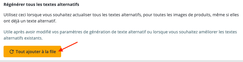 Lorsque vous ajoutez de nouveaux produits ou modifiez les existants (modification de champs significatifs comme le nom, la description courte, la référence/SKU, etc.), la génération ou la mise à jour de texte alternatif est programmée et les produits concernés sont automatiquement mis en fil d'attente (synchronisation automatique).