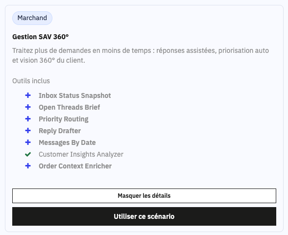 - Cliquez sur "Voir détails" pour consulter la description et les outils inclus dans un scénario.